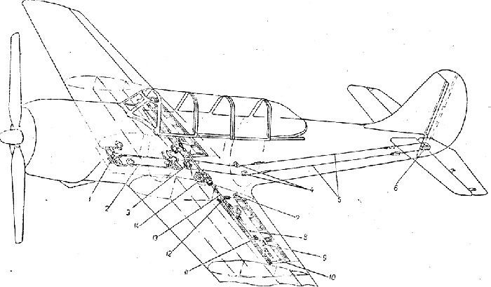 1 — тяга, 2 — тяги, 3 — ручка управления в первой кабине, 4 — вал управления, 5 — ручка управления во второй кабине, 6 — установка штурвала управления триммером Р.В. во второй кабине, 7 — тросовая проводка, 8 — тандеры, 9 — сектор руля высоты с противовесом, 10 — управление триммером руля высоты, 11 — кронштейн с роликом на шпангоуте 16, 12 — тросовая проводка, 13 — направляющие ролики, 14 — тандеры, 15 — установка сектора на шпангоуте 10,