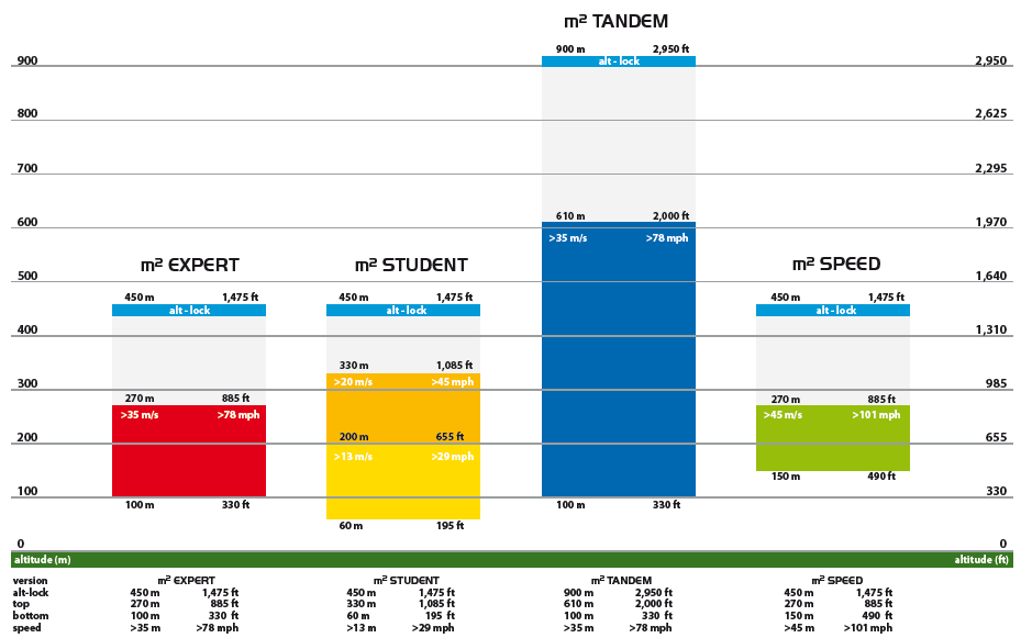 Версия m2 TANDEM предназначена для тандемных комплектов. Активация произойдет, когда высота над площадью приземления будет меньше 610 м (2000 футов), а скорость падения больше 35 м/с-1 (78 миль в час). Высотный замок на 900 м (2950 футов). Активация не произойдет на высоте ниже 100 м (330 футов). Т.е. зона активации находится в интервале от 610 м до 100 м (2000 — 330 футов) над площадью приземления.