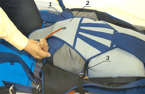 1 — верхний край правого бокового клапана (с маркировкой «3»); 2 — шпилька парашютного звена; 3 — карман эластичный; 4 — звено парашютное; 5 — нижний край правого бокового клапана (с маркировкой «3»); 6 — слабина парашютного звена.