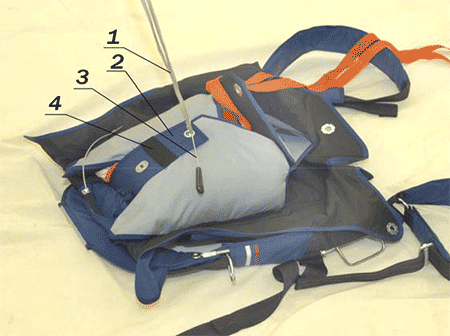 1 — клапан ранца с маркировкой «4»; 2 — шпилька укладочная; 3 — петля.