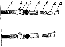 1 — шланг прибора; 2 — хомут со штифтом; 3 — наконечник шланга; 4 — амортизатор; 5 — гайка специальная; 6 — винт специальный; 7 — петля; 8 — серьга алюминиевая.